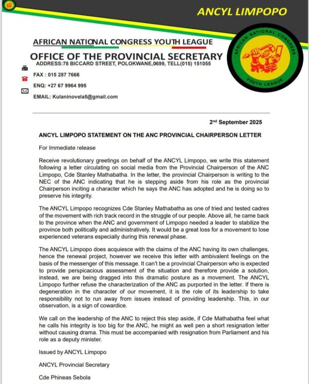 The ANC Youth League in Limpopo has called on the party to reject the resignation of Mathabatha.