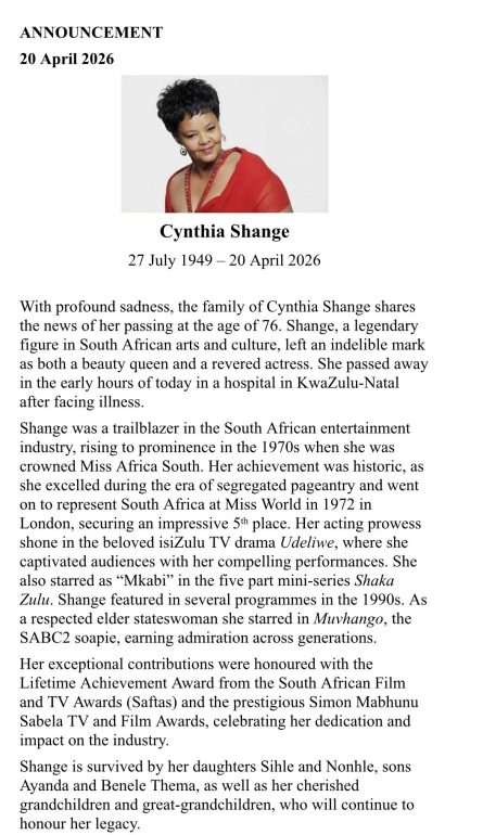 RIP to pioneering South African actress, model and beauty queen – Cynthia Shange pic.twitter.com/wGoRHewtFT