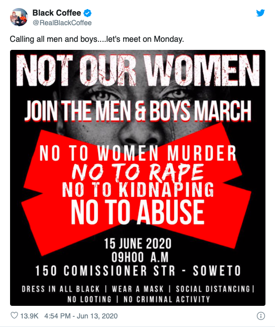 Black Coffee called for “men and boys” to participate in a march that he organised to happen in Soweto. The DJ took to social media to share the details of the march on his social media.