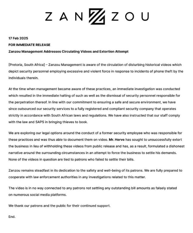 “It is clear that Zanzou’s management and security protocols are grossly inadequate and have allowed such behaviour to take place. The incident is unacceptable, and we denounce any establishment that resorts to such brutal and inhumane treatment of its patrons.”