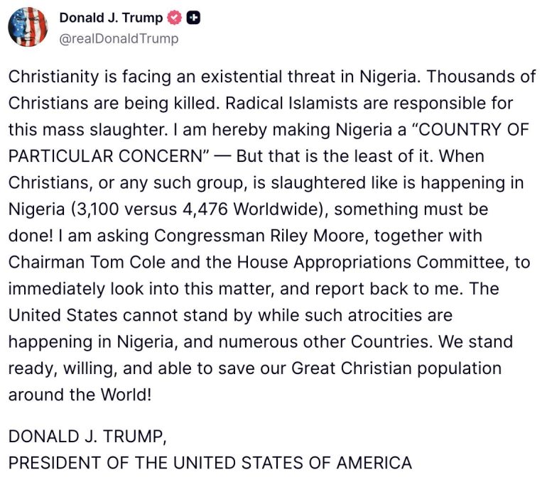 Posting on his Truth Social page, Trump said the United States could deploy troops to Nigeria to halt what he called the “killing of large numbers of Christians” by militant groups.