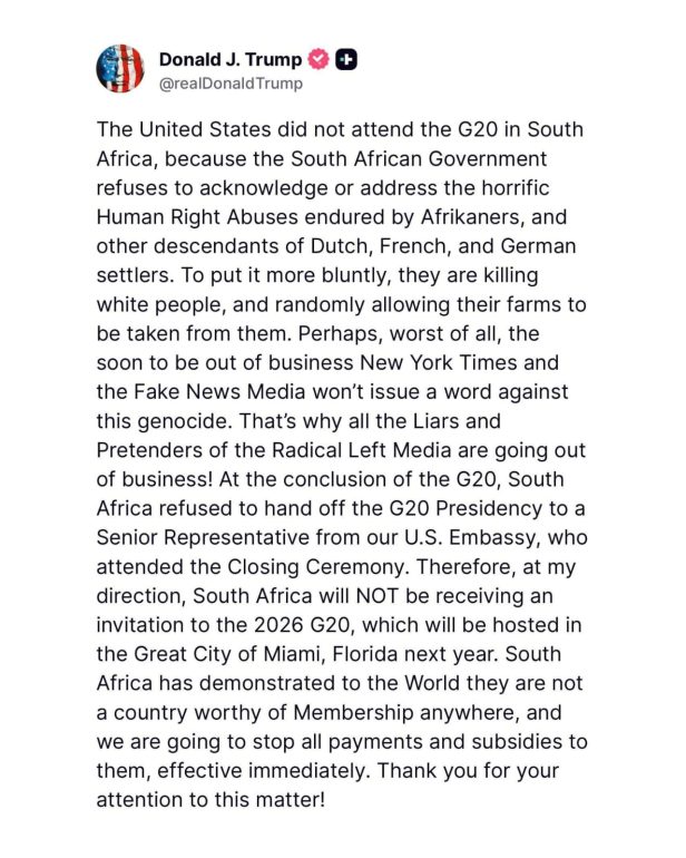 Trump has doubled down on false claims of white killings in South Africa — the same assertions behind his boycott of last week’s G20 Leaders’ Summit in Johannesburg. He has also announced that the US will halt all payments and subsidies to South Africa.